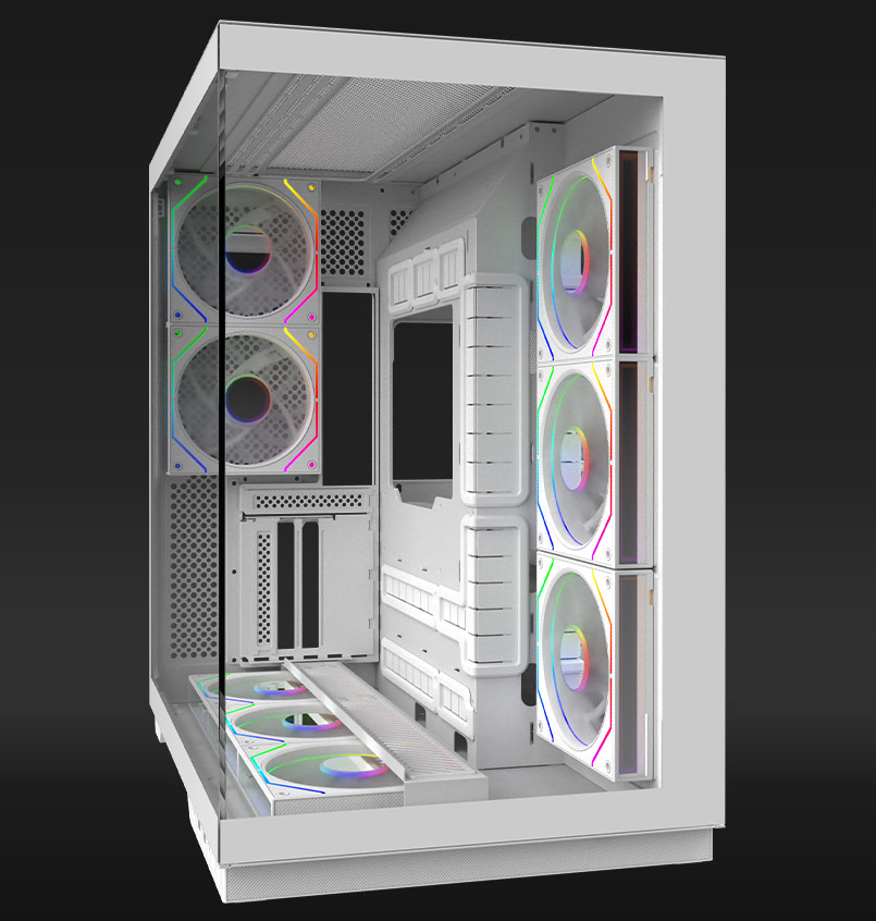 - Installed fans: 8 pieces - Rear 2x 120 mm (ARGB), Side 3x 120mm (ARGB, Reverse blade), Bottom 3x 120 mm (ARGB, Reverse blade)