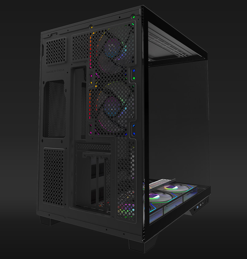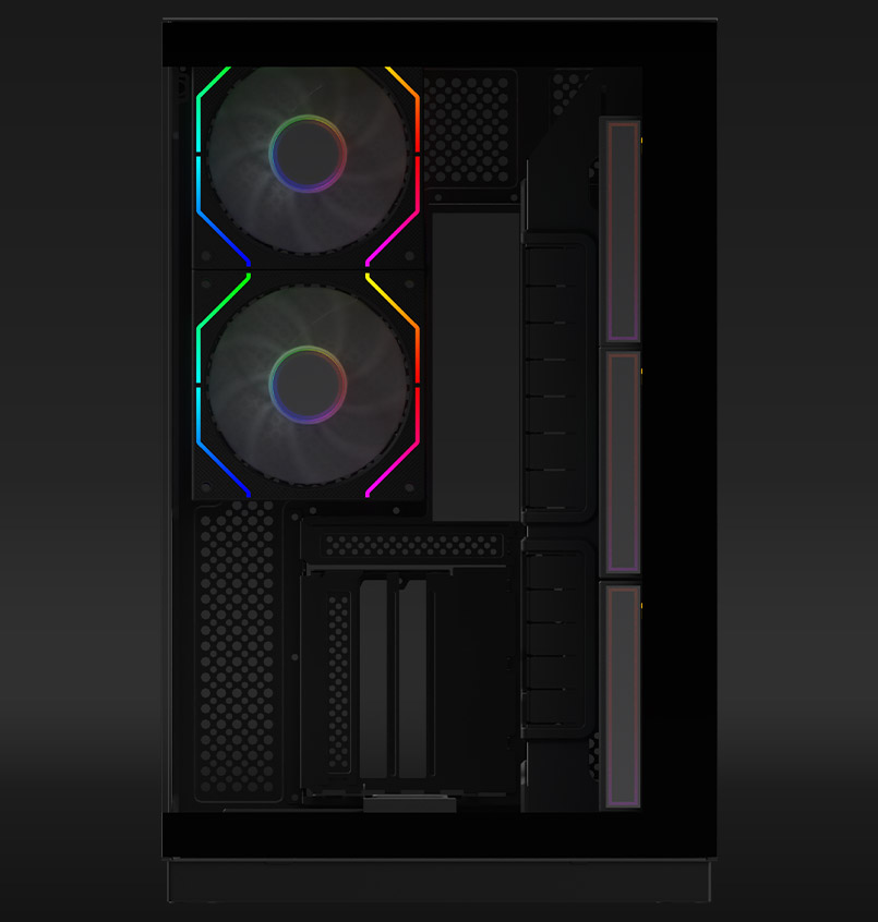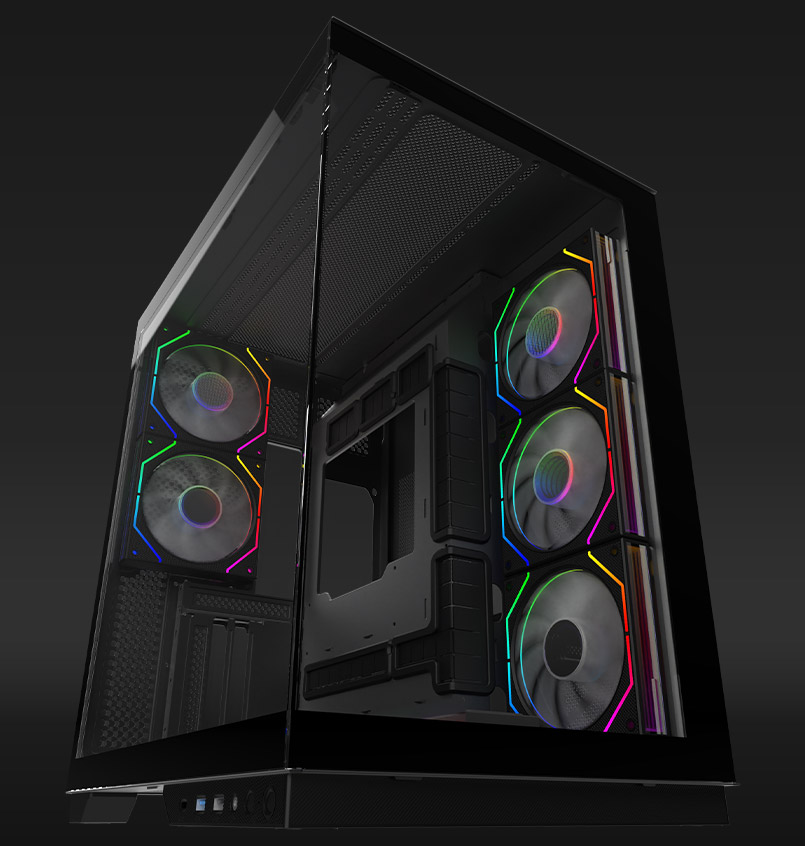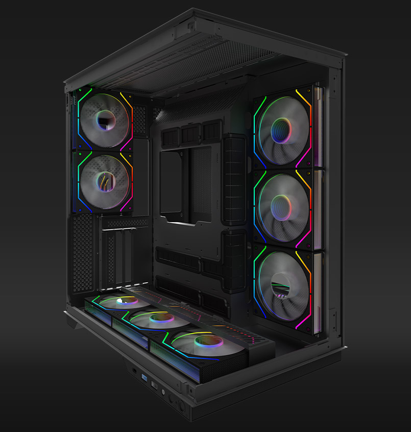JANUS comes loaded with eight pre-installed 120 mm ARGB fans—three on the side, three at the bottom, and two at the rear—all choreographed for optimal airflow and lighting.
