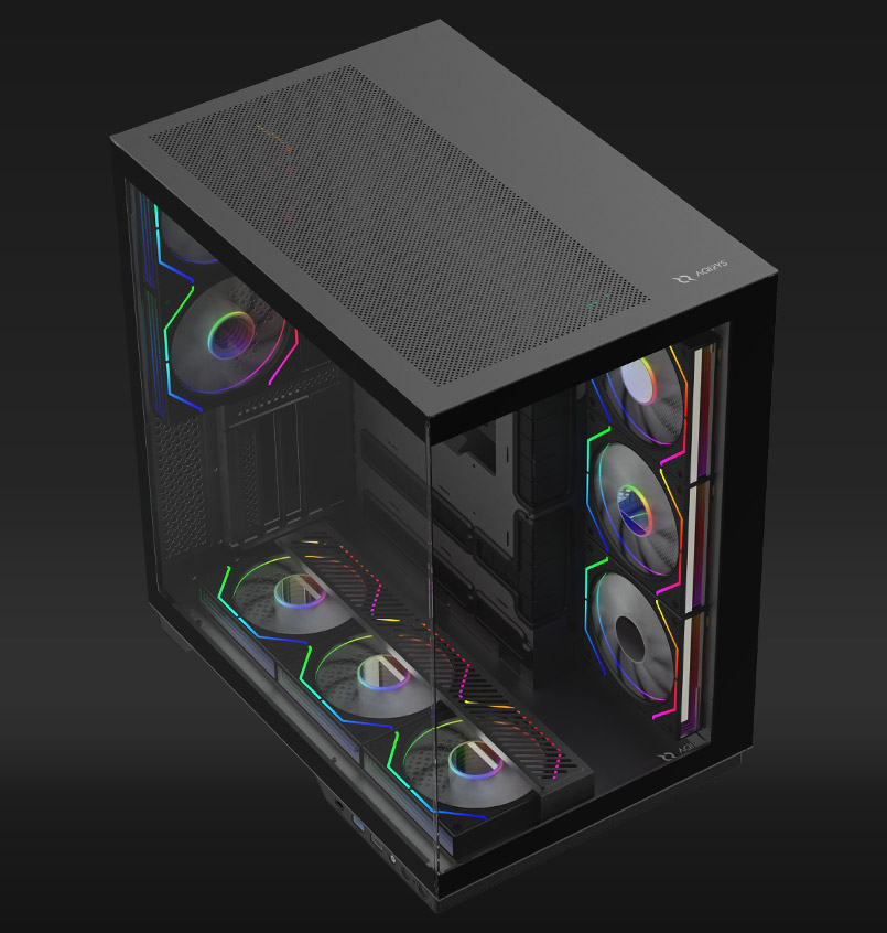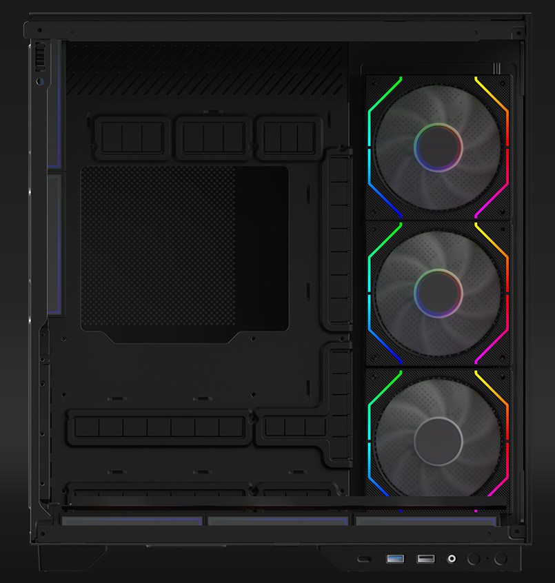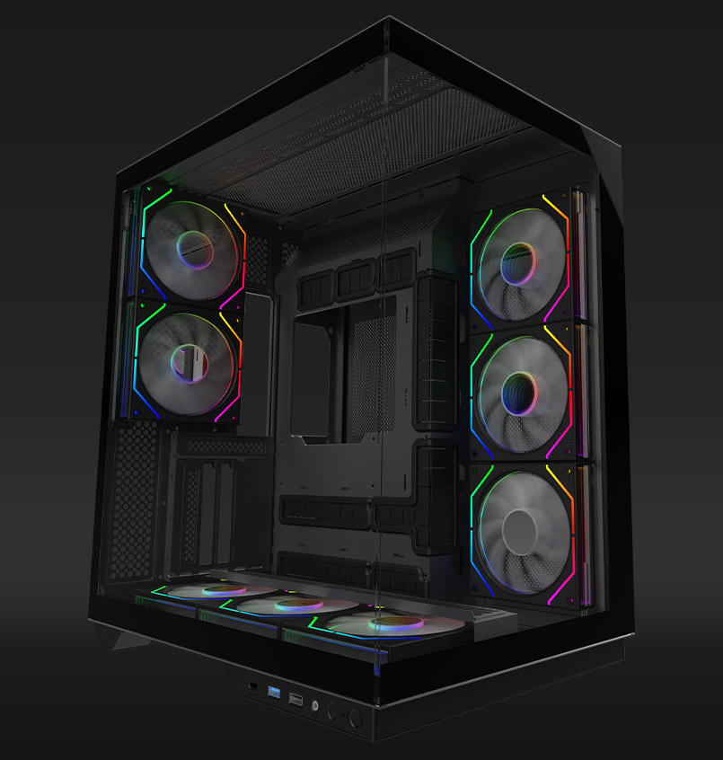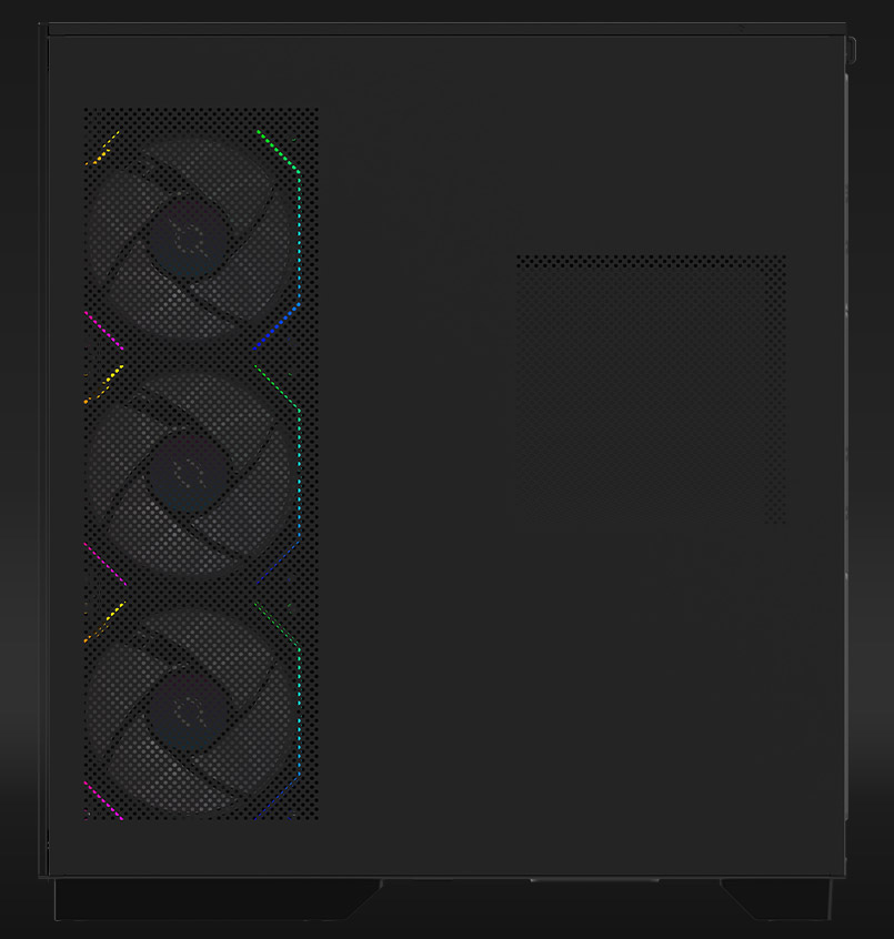 - Installed fans: 8 pieces - Rear 2x 120 mm (ARGB), Side 3x 120mm (ARGB, Reverse blade), Bottom 3x 120 mm (ARGB, Reverse blade)