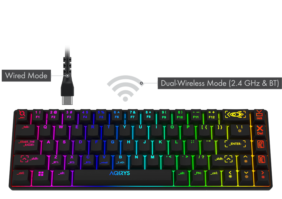 A full-RGB dynamic illumination system sparks life into MIRA’s looks, and the AQIRYS intuitive keyboard software allows in-depth customization when using the keyboard in wired mode. When connected via wireless, you can extend the battery lifetime from 8 hours to 35 days by turning the illumination off.