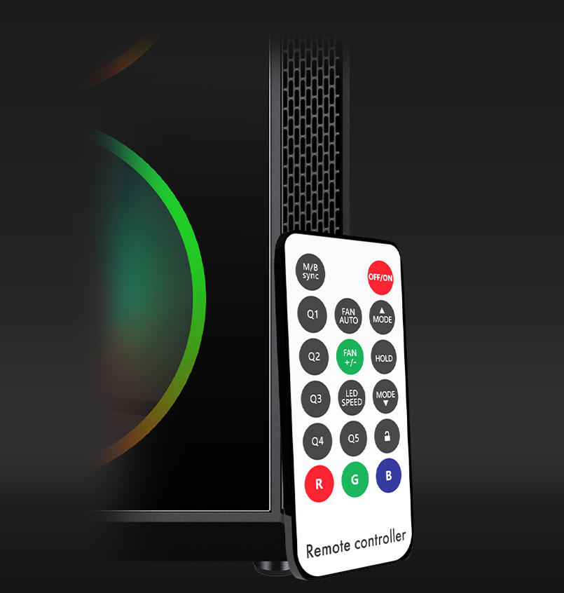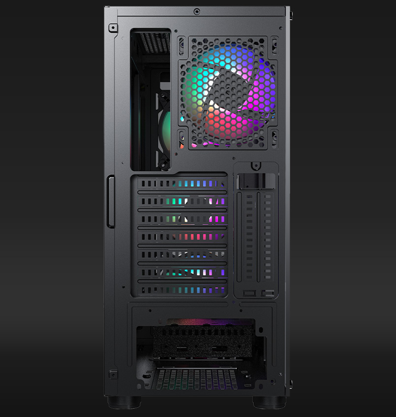 The edge-to-edge light-grey tinted tempered glass side panel of RIGEL provides a full but mysterious view of your gaming rig depths. Crafted from the same tempered glass, the front panel is brought to life by three 3-ring inner RGB fans, ready to put quite a show in the eye of the beholder.