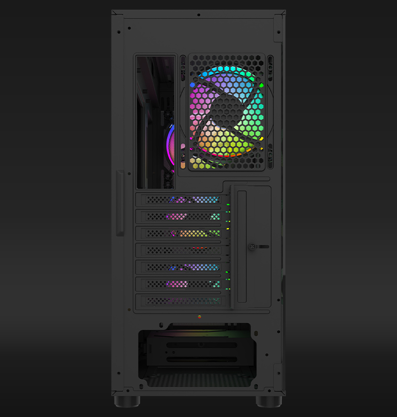 All four 120 mm fans pre-installed in WEZEN use RGB lighting and create the much-needed airflow to cool even the most demanding hardware. The dual air-intake design can help bring more fresh air inside the case by installing two 120 mm fans on the right-side panel. You can further boost the cooling performance by adding three 120 mm (or two 140 mm) extra fans at the top and two 120 mm on the bottom of the case.